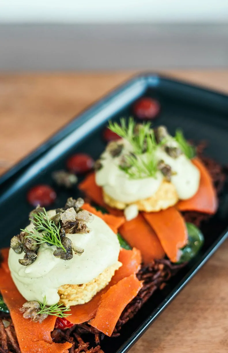 Place a tofu “egg” on each muffin half and spoon warm hollandaise sauce over top.